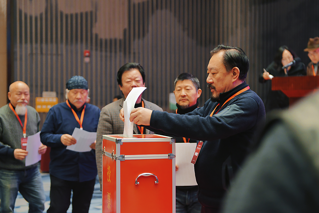 中国雕塑学会副会长霍波洋宣读《中国雕塑学会第五届理事会理事选举办法》和选举理事的监票人、计票人名单