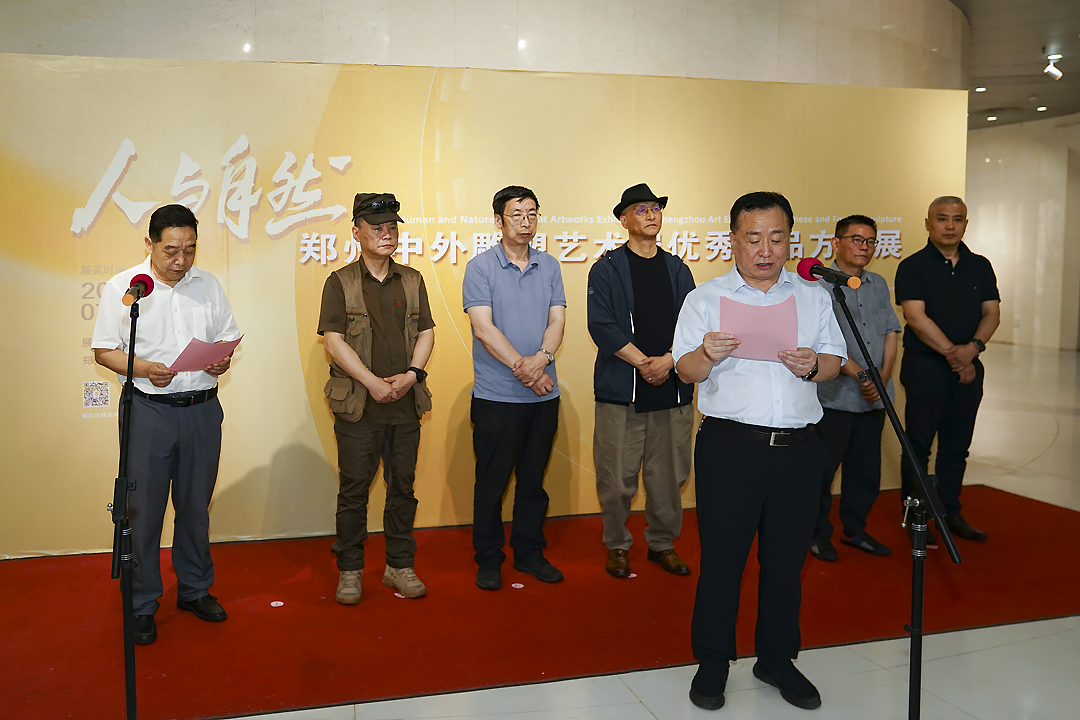 出席开幕式的中国雕塑学会领导包括中国雕塑学会会长、中国美术家协会副主席、上海美术学院院长、清华大学美术学院教授曾成钢,中国雕塑学会副会长、中央美术学院教授殷双喜,中国雕塑学会副会长、湖北美术馆艺术总监傅中望,中国雕塑学会副会长、中国美术学院教授龙翔,上海美术学院副院长、教授翟庆喜,中国雕塑学会办公室主任花春江。出席本次开幕式的郑州市相关领导包括郑州市园林局局长牛建军、副局长赵富荣,河南省工人文化宫主任郭庆、副主任窦可。此外还有郑州市有关部门负责同志以及郑州市园林局系统干部职工和广大市民朋友。开幕式由郑州市园林局副局长赵富荣主持,中国雕塑学会会长曾成钢致开幕词。郑州市园林局局长牛建军宣布2023“人与自然”——郑州中外雕塑艺术展优秀作品方案展开幕。