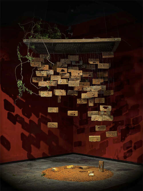 陈建业《树冢》尺寸200?200?100cm、材料:铁、木、玉石、树皮、砖