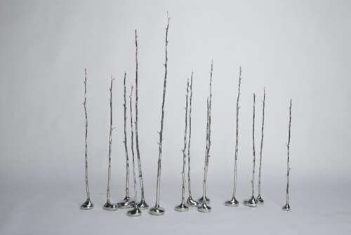 雕塑诞生—— 干枯的树枝是山区人民的柴火,经过打磨,在底端加上露珠造型,转化为不锈钢材质,作为艺术品放在优雅的城市住宅区。枯竭的生命气息重新焕发,原始形态进入现代文明,是我对生命能量传递的理解。 雕塑由树枝本体及模拟的投影组成。不锈钢塑造了雕塑本身和某一瞬间的投影,而雕塑在一天时光的变化中也产生投影,‘真投影’和‘假投影’时而重合,时而离开......
